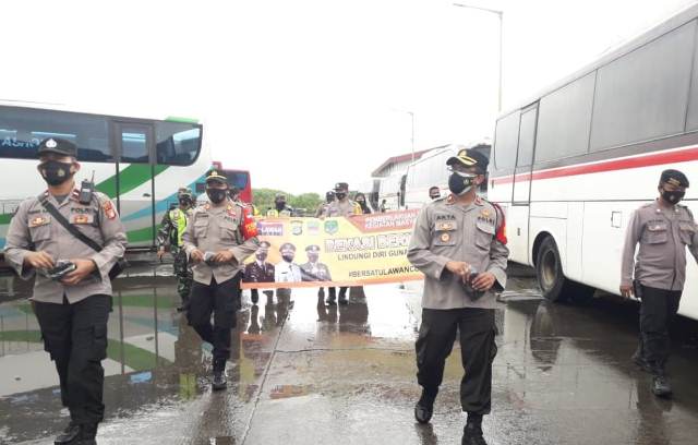 “Hari ini seluruh Polsek yang berada di wilayah hukum Mapolres Metro Bekasi, serentak melakukan giat tematik dengan memberikan dan membagikan masker secara gratis. Salah satunya kepada para penumpang dan sopir bus di pool bus ini,” terang Kapolsek Cikarang Barat. (agus / arl)