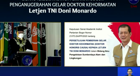 JAKARTA – Kepala Badan Nasional Penanggulangan Bencana (BNPB) Letjen TNI Doni Monardo menerima gelar kehormatan Doktor Honoris Causa dari Institut Pertanian Bogor (IPB), Sabtu (27/3/2021). Gelar