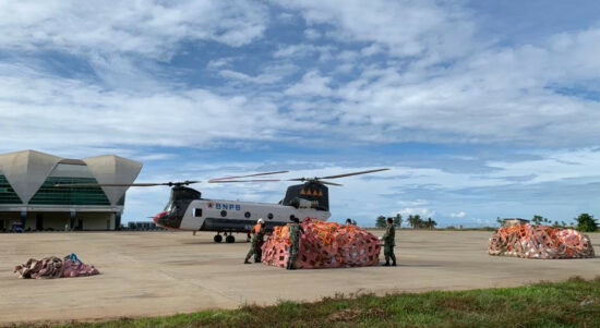 MAMUJU – Setelah menunggu cuaca kondusif, helikopter berjenis Chinook yang dioperasikan BNPB berbadan besar dengan dua baling-baling akhirnya terbang dengan mengangkut muatan