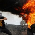 Seorang pengunjuk rasa Palestina melemparkan batu dari balik tumpukan ban yang terbakar saat konfrontasi dengan pasukan keamanan Israel di desa Beita, Tepi