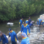 Pasukan Biru Suku Dinas Sumber Daya Air (SDA) Kepulauan Seribu membangun tanggul di sisi selatan Pantai Ambalat, RT 04/01, Kelurahan Pulau Harapan,