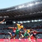 Hansle Parchment dari Jamaika finis pertama di depan Grant Holloway dari Tim Amerika Serikat di final110m putra, pada hari ketiga belas Olimpiade