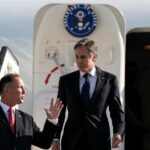 Menteri Luar Negeri AS Antony Blinken disambut oleh Kepala Protokol Negara Israel Gil Haskel, saat ia turun dari pesawat, setibanya di Bandara