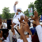 Rizieq Shihab, Pimpinan Front Pembela Islam Indonesia (FPI) yang menetap di Arab Saudi sejak 2017, menyapa orang-orang setibanya di Bandara Internasional Soekarno-Hatta