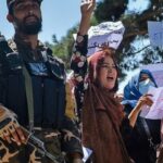 Wanita Afghanistan meneriakkan slogan-slogan di samping seorang pejuang Taliban selama demonstrasi di dekat kedutaan Pakistan di Kabul. (Foto: AFP/Arab News) JAKARTA (Kabul)