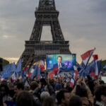 Presiden Prancis Emmanuel Macron merayakan kemenangan bersama para pendukungnya di depan Menara Eiffel di Paris, pada 24 April 2022. (Foto: AP/Rafael Yaghobzadeh/Arab