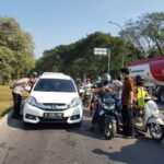 JAKARTA (Bekasi)- Kapolsek Cikarang Pusat AKP Awang Parikesit, di Pos Penyekatan TL Delta Mas, Desa Hegarmukti, Cikarang Pusat. Kabupaten Bekasi, puluhan kendaraan